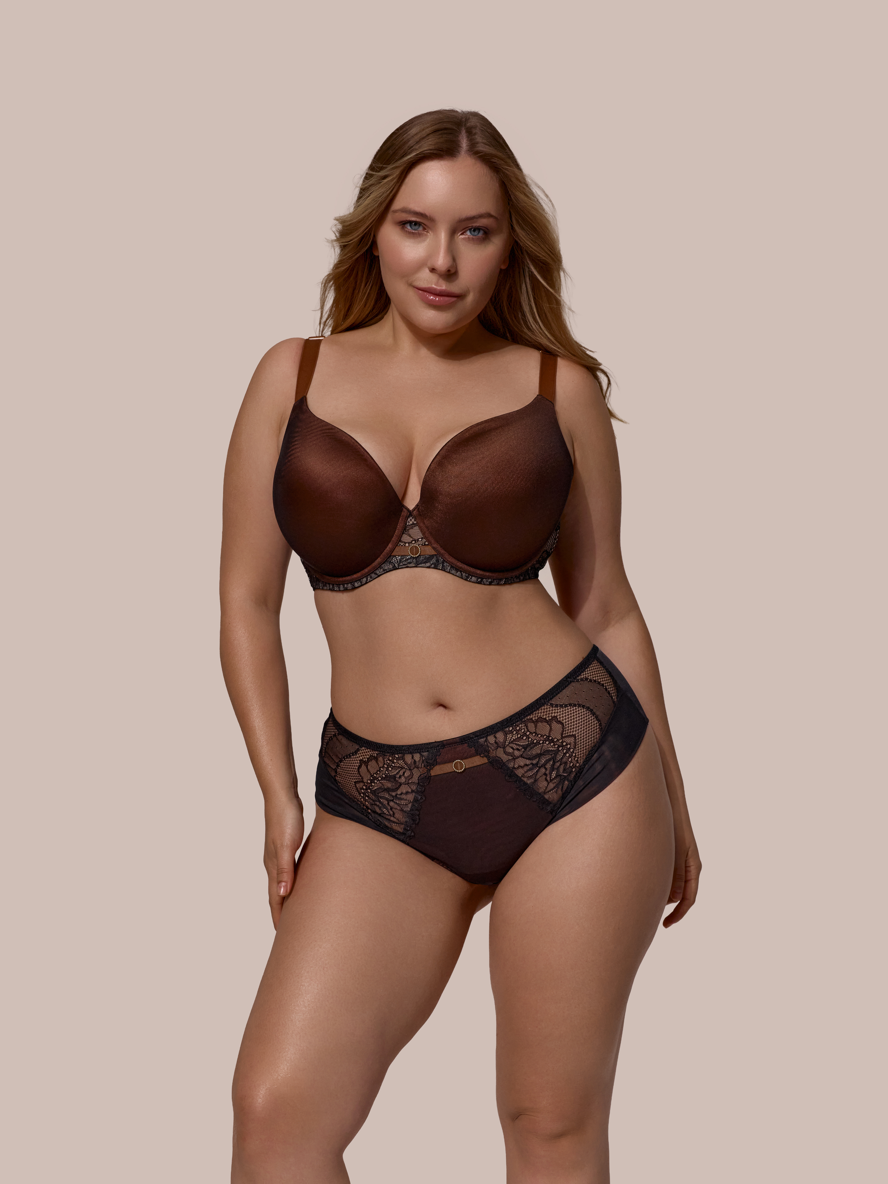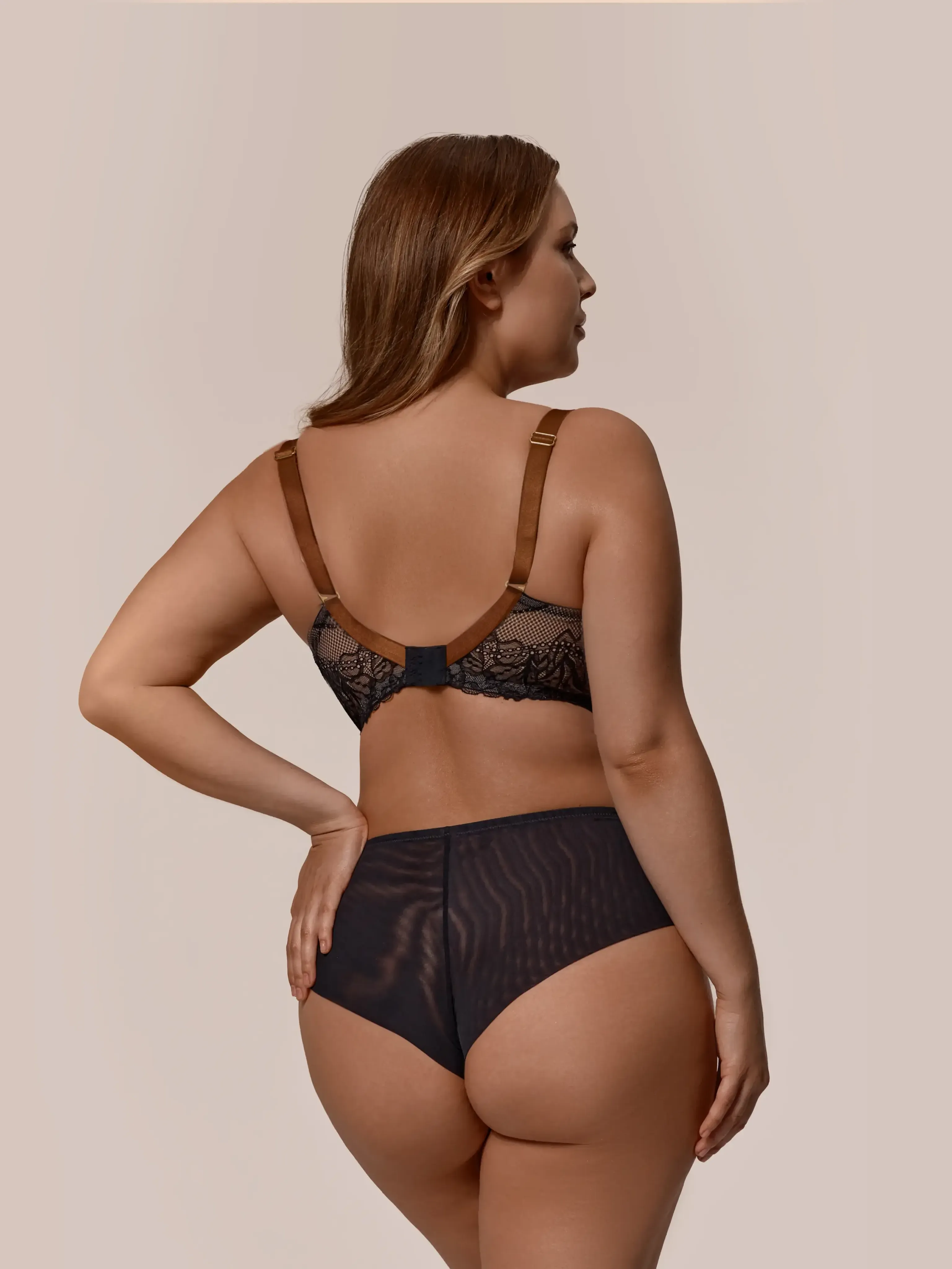 Широкий пояс с изящной спинкой «леотард» гарантирует правильную посадку и деликатную коррекцию силуэта. Переходное кольцо задней бретели заменено на аккуратную треугольную направляющую пряжку, которая не только украшает модель, но и поддерживает надёжное и корректное положение бретели.